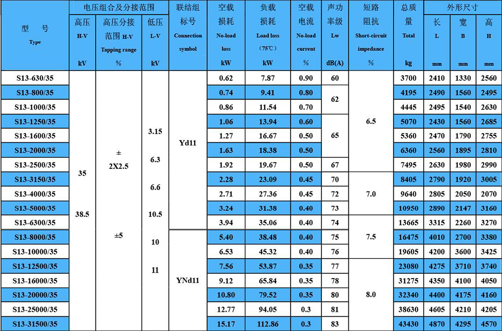 S13型油浸式電力變壓器采用新材料、新工藝、新結構,優化設計,精心制造,與S11型相比,空載損耗下降25%,空載電流下降35%,年運行成本下降10.5%。